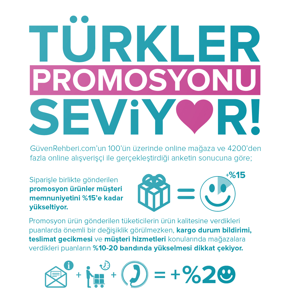 GüvenRehberi.com’un 100’ün üzerinde online mağaza ve 4 bin 200’den fazla online alışverişçi ile gerçekleştirdiği anketin sonucuna göre, müşterinin siparişiyle birlikte gönderilen promosyon ürünler müşteri memnuniyetini yüzde 15’e kadar yükseltiyor. GüvenRehberi.com, e-ticaret sektöründe müşteri memnuniyetine ilişkin ilgi çekici bir analiz yayınladı. GüvenRehberi.com’un 100’ün üzerinde online mağaza ve 4200’den fazla online alışverişçi ile gerçekleştirdiği anketin sonucuna göre, sipariş ürünlerin yanında gönderilen ücretsiz promosyonlar, müşteri memnuniyetini yüzde 15’e kadar artırıyor. Promosyon ürün gönderilen tüketicilerin ürün kalitesine verdikleri puanlarda önemli bir değişiklik görülmezken, kargo durum bildirimi, teslimat gecikmesi ve müşteri hizmetleri konularında mağazalara verdikleri puanların yüzde 10-20 bandında yükselmesi dikkat çekiyor.