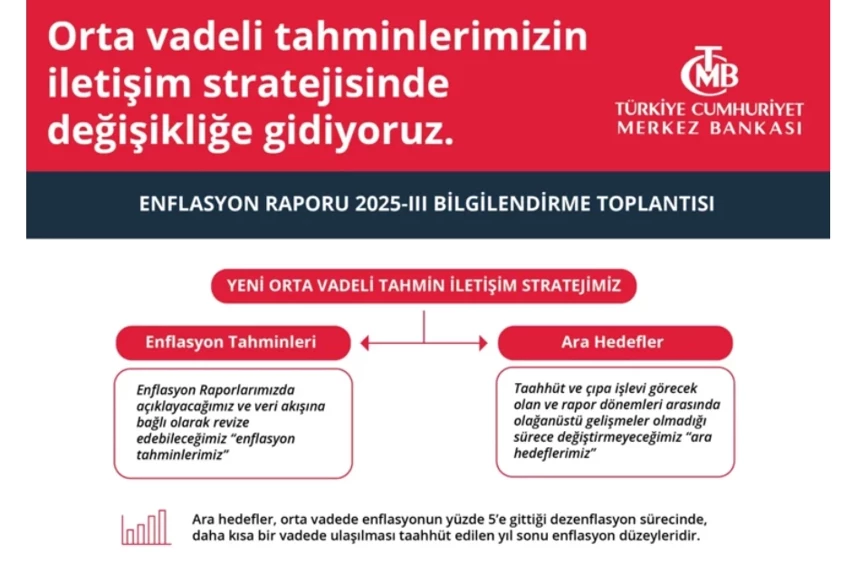 Türkiye Cumhuriyet Merkez Bankası (TCMB), TCMB Başkanı Fatih Karahan’ın 3. Enflasyon Raporu Toplantısında duyurduğu yeni orta vadeli iletişim stratejisinin detaylarını açıkladı. Orta vadede enflasyonun yüzde 5’e gittiği dezenflasyon sürecinde daha kısa bir vadede ulaşılması taahhüt edilen yıl sonu enflasyon düzeyleri olan “ara hedefler” para politikası düzeyinin ayarlanmasında referans olarak alınacak.