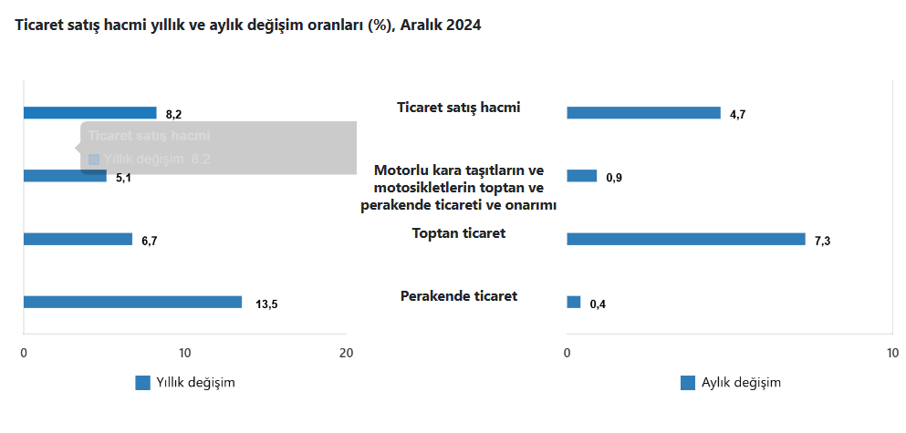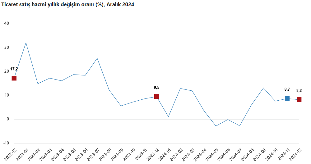 Buna göre, ticaret satış hacmi 2024'ün son ayında bir önceki yılın aynı ayına göre yüzde 8,2 arttı.