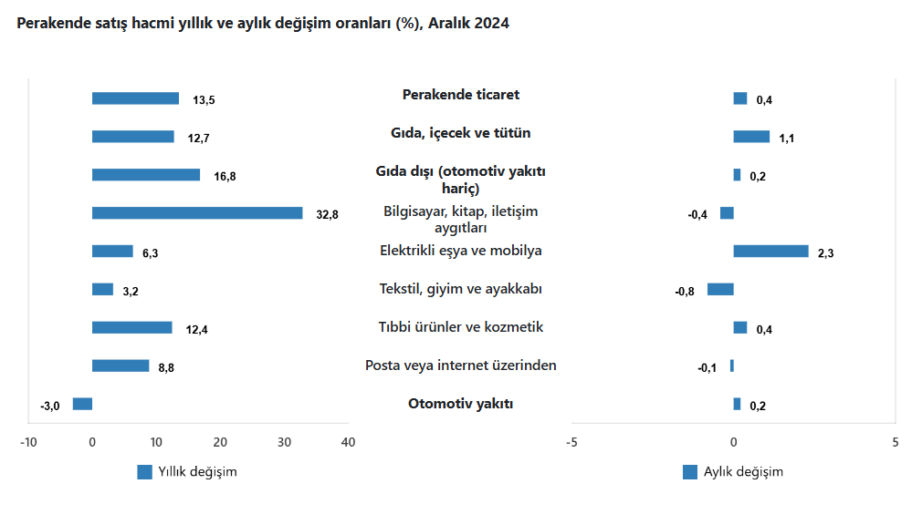 TÜİK verilerine göre, ticaret satış hacmi 2024 Aralık ayında bir önceki yılın aynı ayına göre yüzde 8,2 arttı. Perakende satış hacmi ise aralık ayında aylık yüzde 0,4, yıllık 13,5 artış gösterdi. Böylece rerakende satış hacmi beş ayın en düşük artışı olarak kaydedildi.