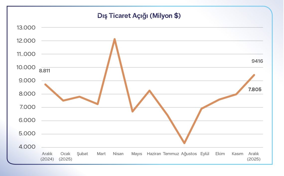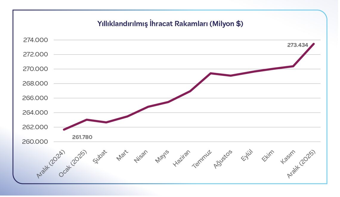 Aralık ayı verileriyle birlikte 2025 yılının dış ticaret performansı belli oldu. Böylece, Türkiye ekonomisi 2025 yılının tamamında ihracatını bir önceki yıla göre %4,5 artırarak 273 milyar 434 milyon dolara yükseltti. 2025 yılında ithalat ise %6,3 artarak 365 milyar 524 milyon dolar oldu. 2025 yılında dış ticaret hacmi ise %5,5 artışla 638 milyar 958 milyon dolar seviyesine çıktı. Geçen yıl 273,4 milyar dolara ulaşan ihracata en büyük katkıyı yine otomotiv sektörü verdi. Otomotiv, 41,5 milyar dolarla ihracat şampiyonu olurken, kimyevi maddeler 31,9 milyar dolarla ikinci, elektrik elektronik 17,7 milyar dolarla üçüncü sırada yer aldı.
