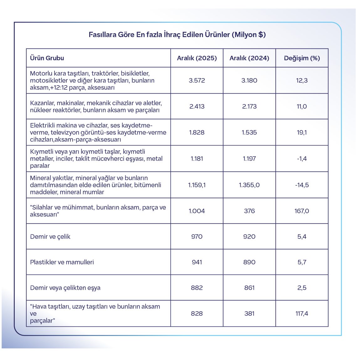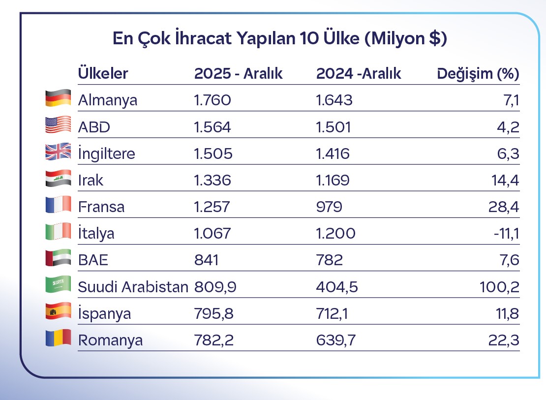 En fazla ihracat yapılan 10 ülke arasında pozitif anlamda en güçlü değişim %100 artışla Suudi Arabistan oldu. Ülkeye 2024 Aralık ayında yapılan 405 milyon dolarlık ihracat 2025 Aralık ayında 810 milyon dolara çıktı. Suudi Arabistan’ın ardından en güçlü aylık ihracat artışları %28,4 ile Fransa ve %22,3 ile Romanya’da görüldü. En çok ihracat yapılan 10 ülke arasında oransal olarak tek düşüş yaşanan ülke %11,1’lik gerilemeyle İtalya oldu.