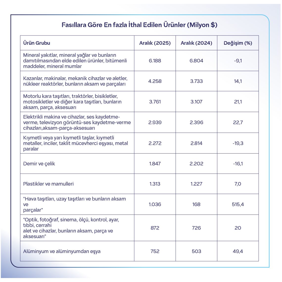 İthalatta ise zirvede yer alan mineral yakıtlar kaleminde Kasım ayında %9,1’lik düşüş yaşandı. Hava ve uzay taşıtları fasılı ise %515’lik artışla aralık ayında ithalatını 6 katına çıkardı.