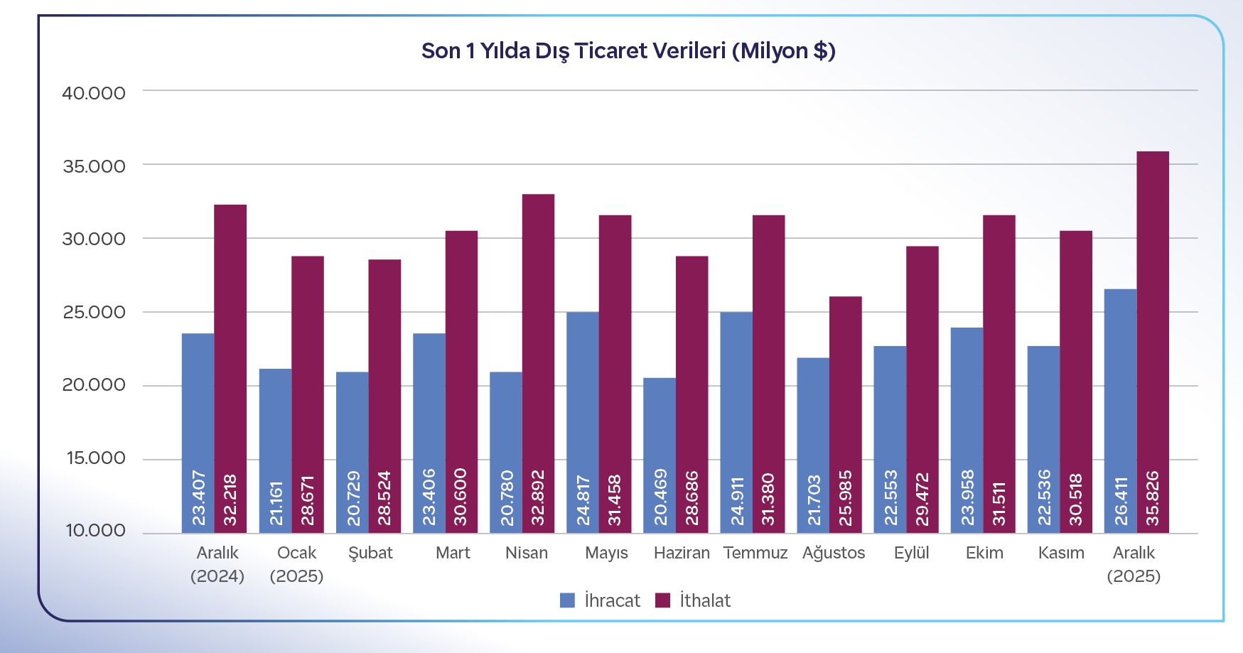 Ticaret Bakanlığı tarafından açıklanan verilere göre, Türkiye ekonomisi, aralık ayında 26 milyar 411 milyon dolar ihracat; 35 milyar 826 milyon dolarlık ithalat rakamına ulaştı. Yıllık bazda değerlendirildiğinde ihracat %12,8 artarken, ithalat tutarı ise %11,2 oranında yükseldi. Aralık ayında dış ticaret hacmi ise %11,9 artış göstererek 62 milyar 237 milyon dolar olarak kaydedildi. Kasım ayında ihracat 22 milyar 718 milyon dolar, ithalat 30 milyar 523 milyon dolar düzeyinde gerçekleşmişti.