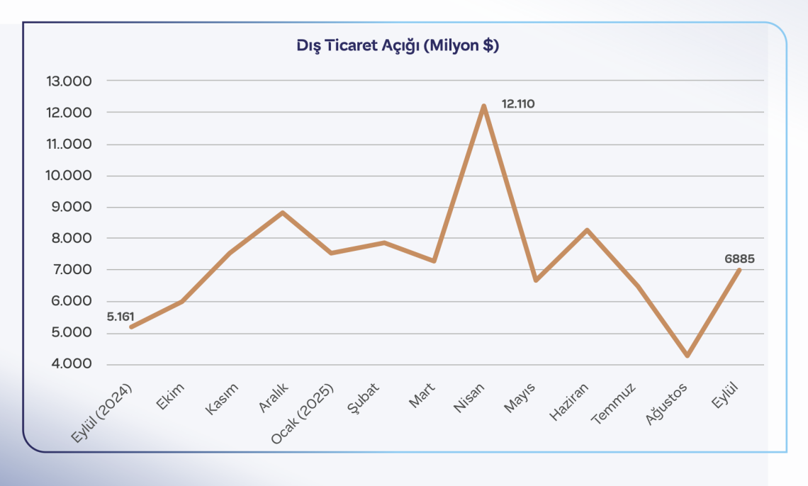 Eylül ayında dış ticaret açığı 6 milyar 885 milyon dolar ile geçen yılın aynı dönemine göre %33,4'lük artış gösterdi. 2024 Eylül döneminde dış ticaret açığı 5 milyar 161 milyon dolar düzeyindeydi. Yıllık bazda dış ticaret açığı ise 67 milyar 26 milyon dolar ile bir önceki yılın aynı dönemine göre %11,8 arttı.