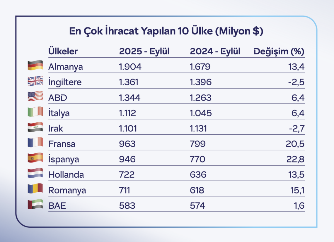 Ticaret Bakanlığı tarafından açıklanan geçici verilere göre, Eylül ayında Türkiye'den en fazla ihracat yapılan ülke 1 milyar 904 milyon dolarla Almanya oldu. Ağustos ayında yıllık bazda ihracatımızı %13,4 artırdığımız Almanya'ya Ağustos ayında ise 1 milyar 776 milyon dolar ihracat yapılmıştı. Almanya ile geçen yılın aynı döneminde 1 milyar 679 milyon dolarlık ihracat yapılmıştı.