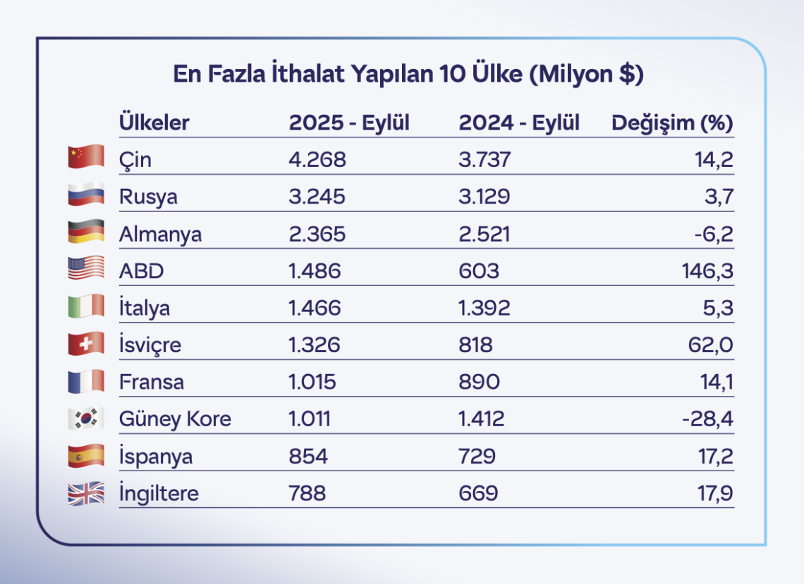 Türkiye'nin en çok ithalat yaptığı ülkelerde Çin yine zirveyi kaptırmazken söz konusu ülkeden ithalatımız, 4 milyar 268 milyon dolarla yıllık bazda %14,2 arttı. Çin'den ithalat bir önceki ay olan Ağustos'ta 3 milyar 97 milyon dolar, geçen yılın Eylül ayında ise 3 milyar 737 milyon dolar olmuştu.