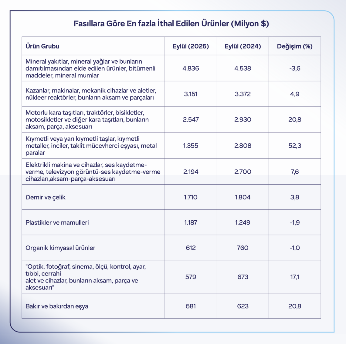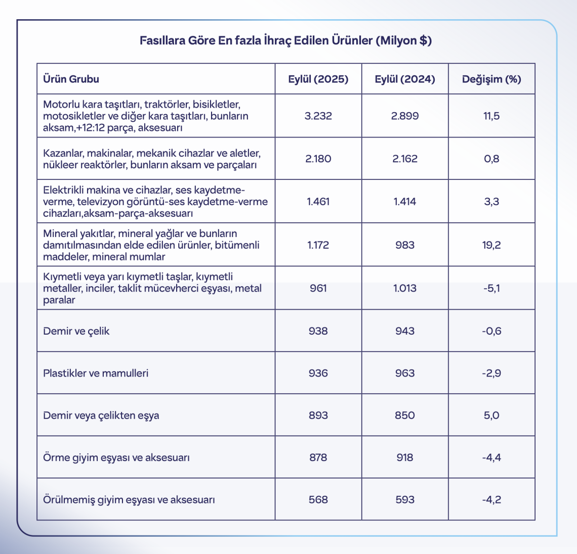 Türkiye'nin amiral sektörlerinden otomotiv sektörünün ihracatı, Eylül ayında %11,5 artışla 3 milyar 232 milyon dolarla en fazla ihracat yapan sektör oldu. Fasıllara göre ihracat kalemlerinde ilk 10'daki ürün gruplarından 5'inde düşüş 5'inde artış görülürken mineral yakıtlar fasılındaki %19,2'lik ön plana çıktı. Demir ve çelik ürünlerdeki ithalatta da %5'lik artış görüldü.