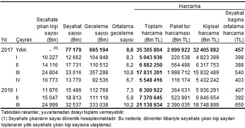 2018’im üçüncü çeyreğinde yurt içinde ikamet eden 24 milyon 999 bin kişi seyahate çıkarken, toplam seyahat harcamaları 21 milyar 138 milyon 934 bin lira olarak gerçekleşti.